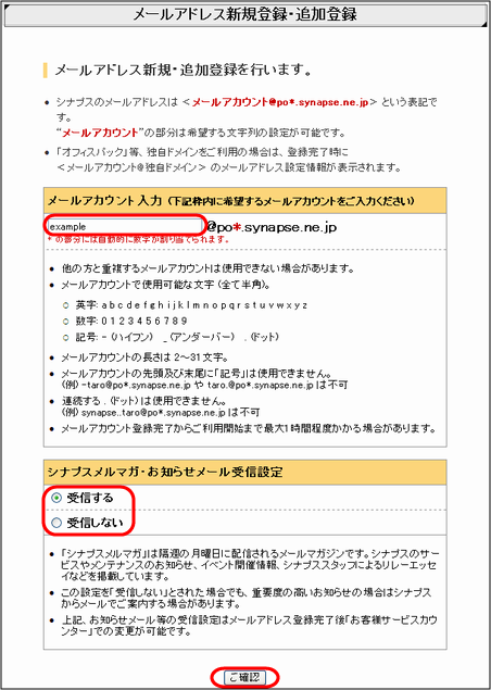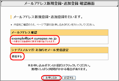 [シナプスメルマガ・お知らせメール受信設定]を確認して[ご確認]ボタンをクリックします。 - [メールアカウント新規・追加登録 確認画面]が表示されますので、入力したメールアカウントで間違いないか確認し、[お申し込み]ボタンをクリックします。